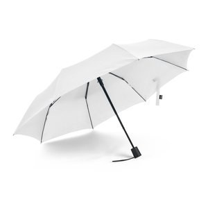 2-in-1 umbrella with recycled polyester shopping bag included. The 21'' folding umbrella in recycled polyester (100% rPET) pongee 190T, fibreglass rods, metal pole and handle in recycled ABS (35% recycled). Folding umbrella in 3 sections, with automatic opening and windproof. Shopping bag in recycled polyester, which can be stored for transport or used separately