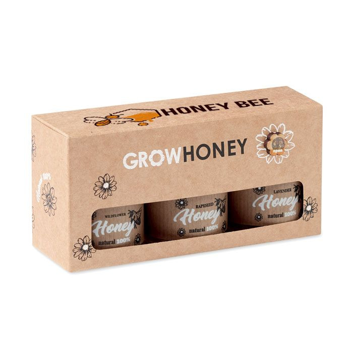 Selection of 3 natural honey jars with a wooden honey dipper.Wildflower, lavender and rapeseed honey (50g each).
