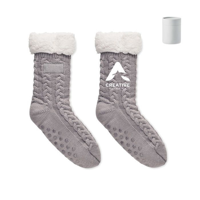 Pair of cable knit slipper socks with non-slip grippers on the bottom in Acrylic twine and 240 gr/m² faux sherpa lining.