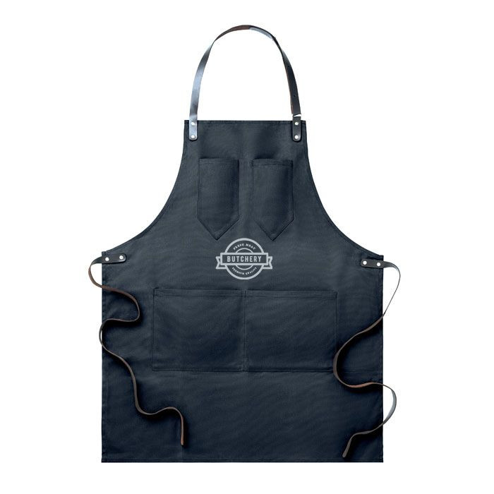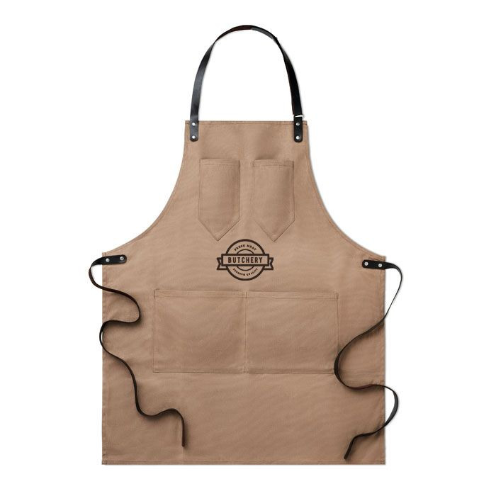 Apron in waxed canvas with leather details, adjustable strap with 2 chest pockets and 1 large low level pocket.