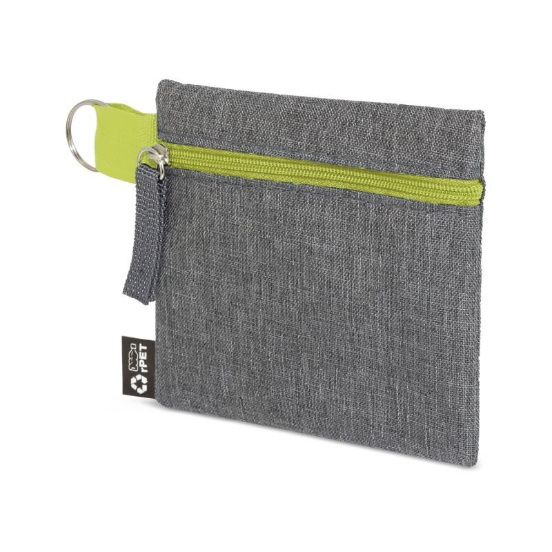 Coin purse made of RPET with melange finish. Colored zip closure. Equipped with a practical ribbon with a ring for transportation, coordinated in color with the zip.