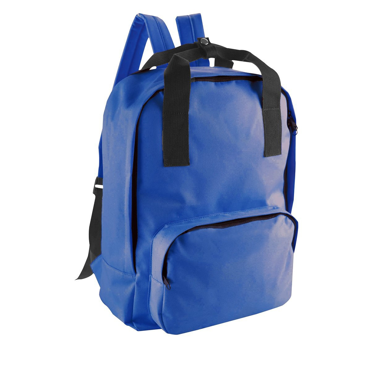 Backpack in polyester with zipper closure. Front pocket with zip, reinforced handles and adjustable straps.