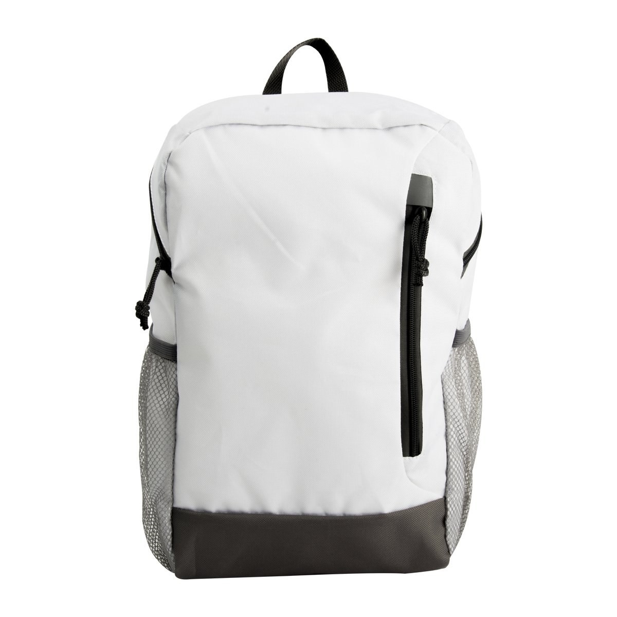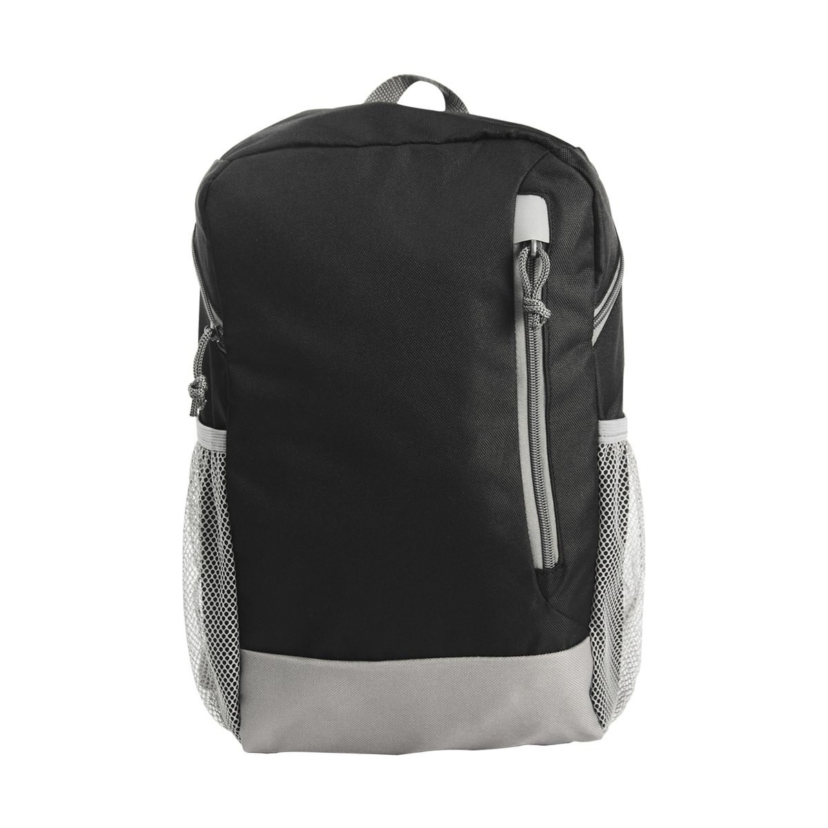 Backpack in polyester with zipper closure. Front pocket with zip, reinforced handle and adjustable straps.