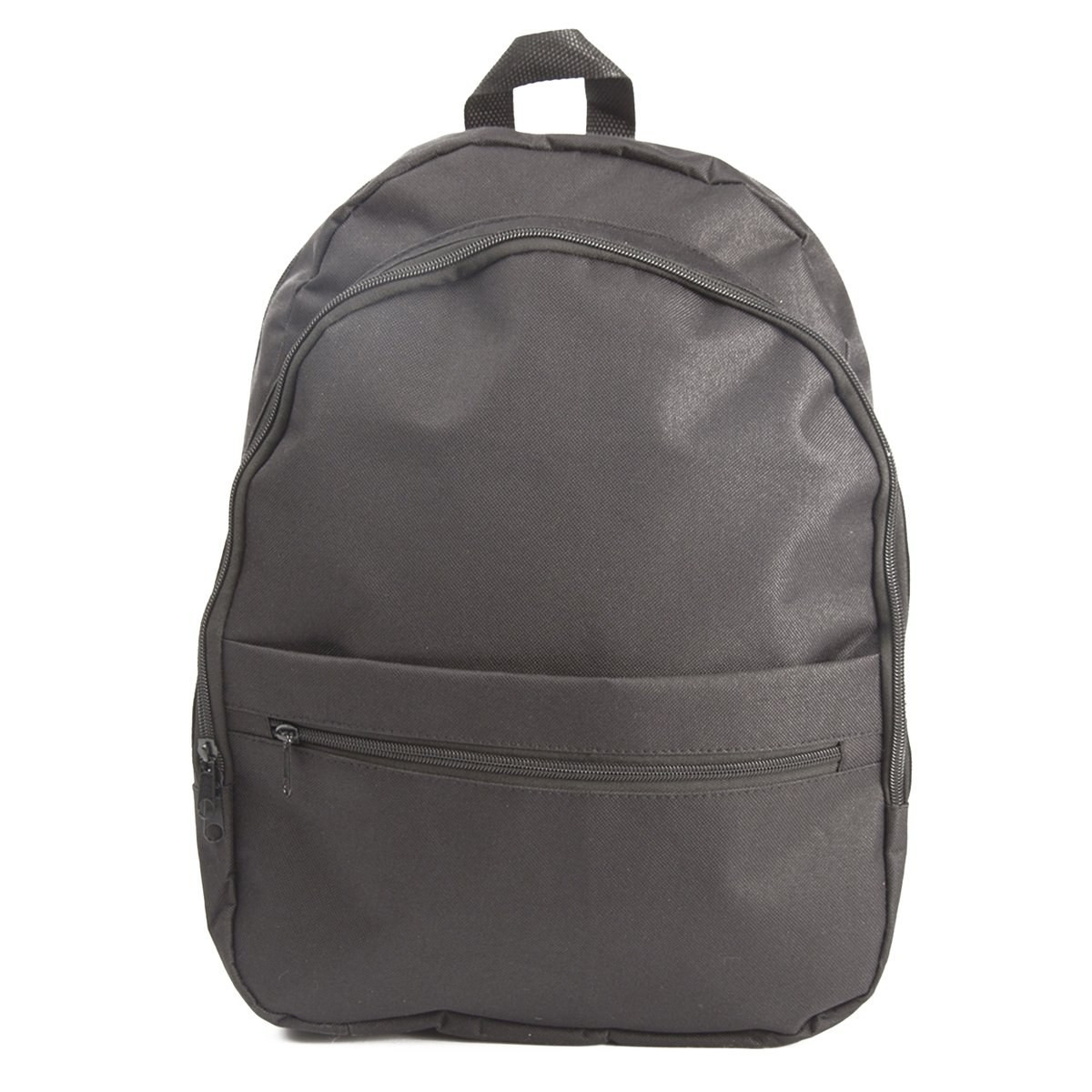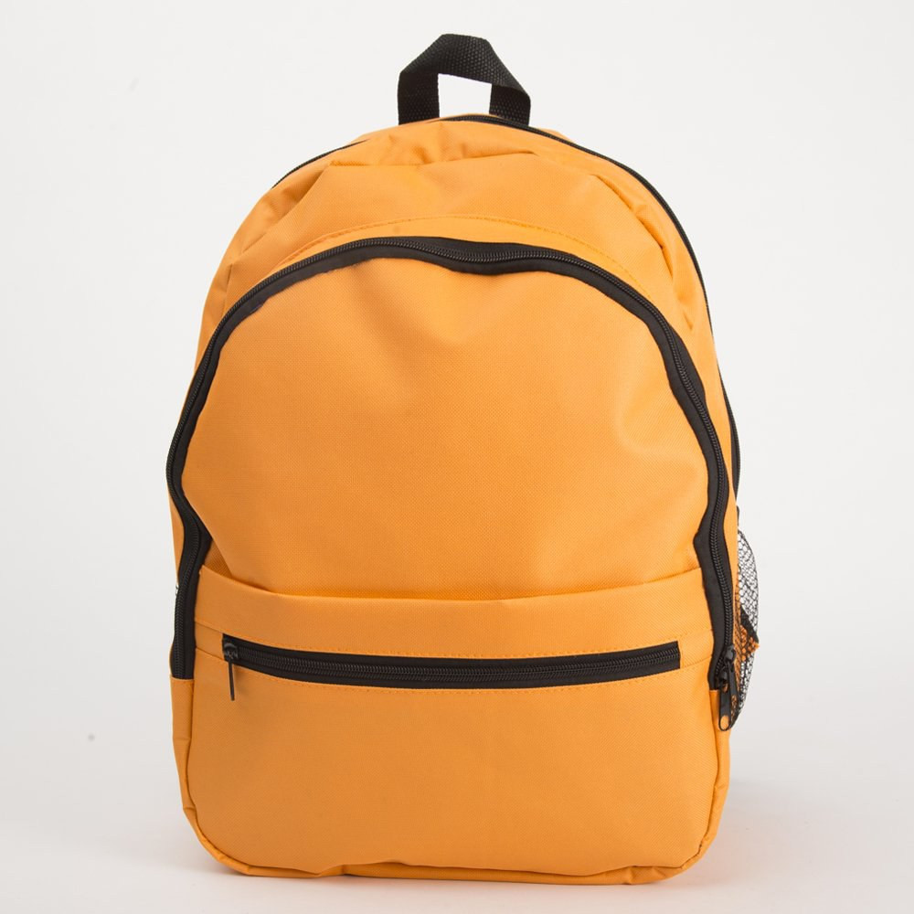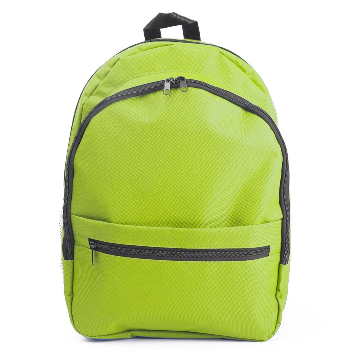 Backpack with 2 main compartments with zipper closure. One front pocket with zip and one open. Side mesh pocket. Adjustable straps.