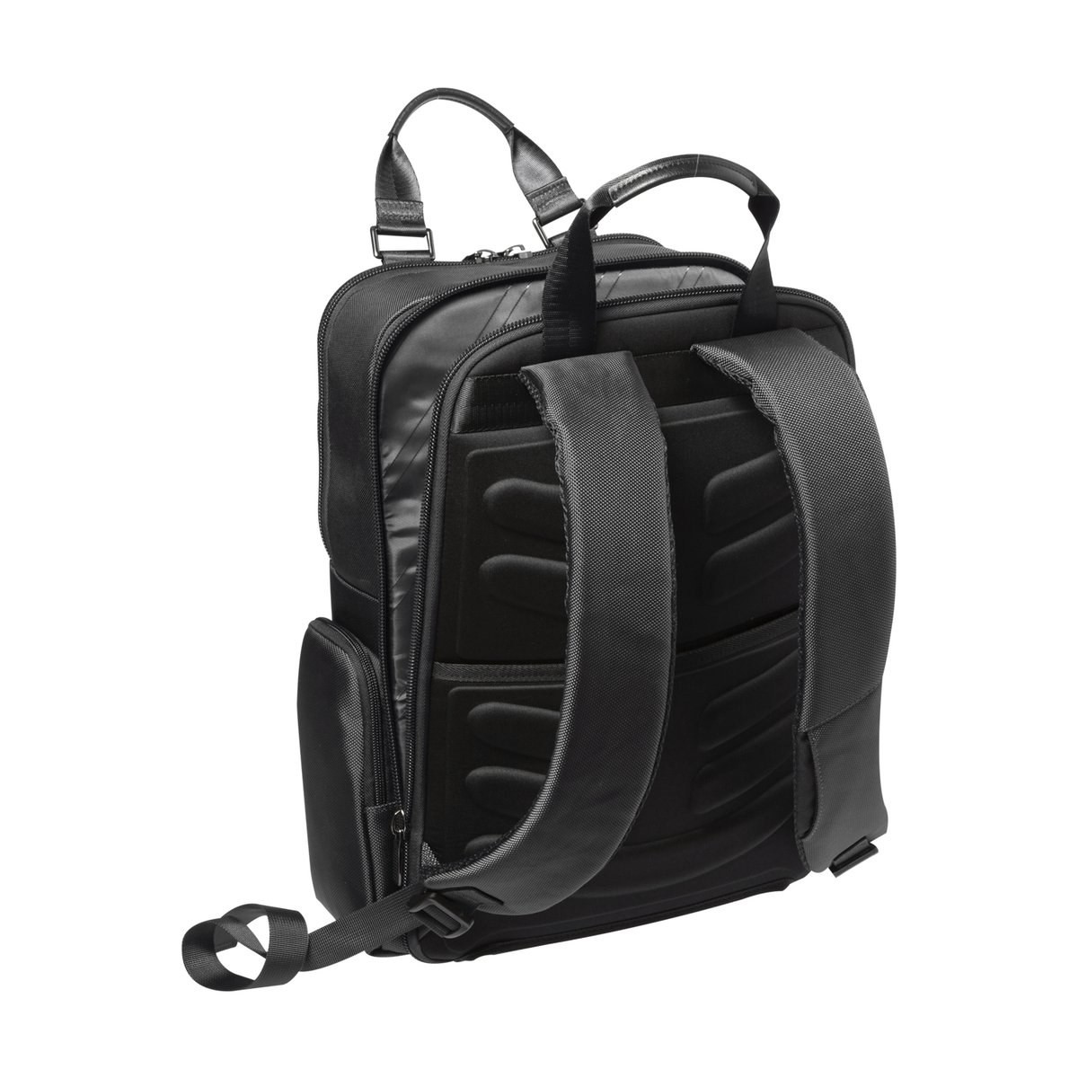 Business laptop backpack with two main zippered compartments, one padded laptop compartment. Several internal pockets in the padded compartment. Two front zippered pockets. Two side pockets, one with a USB port inside. Padded back panel.