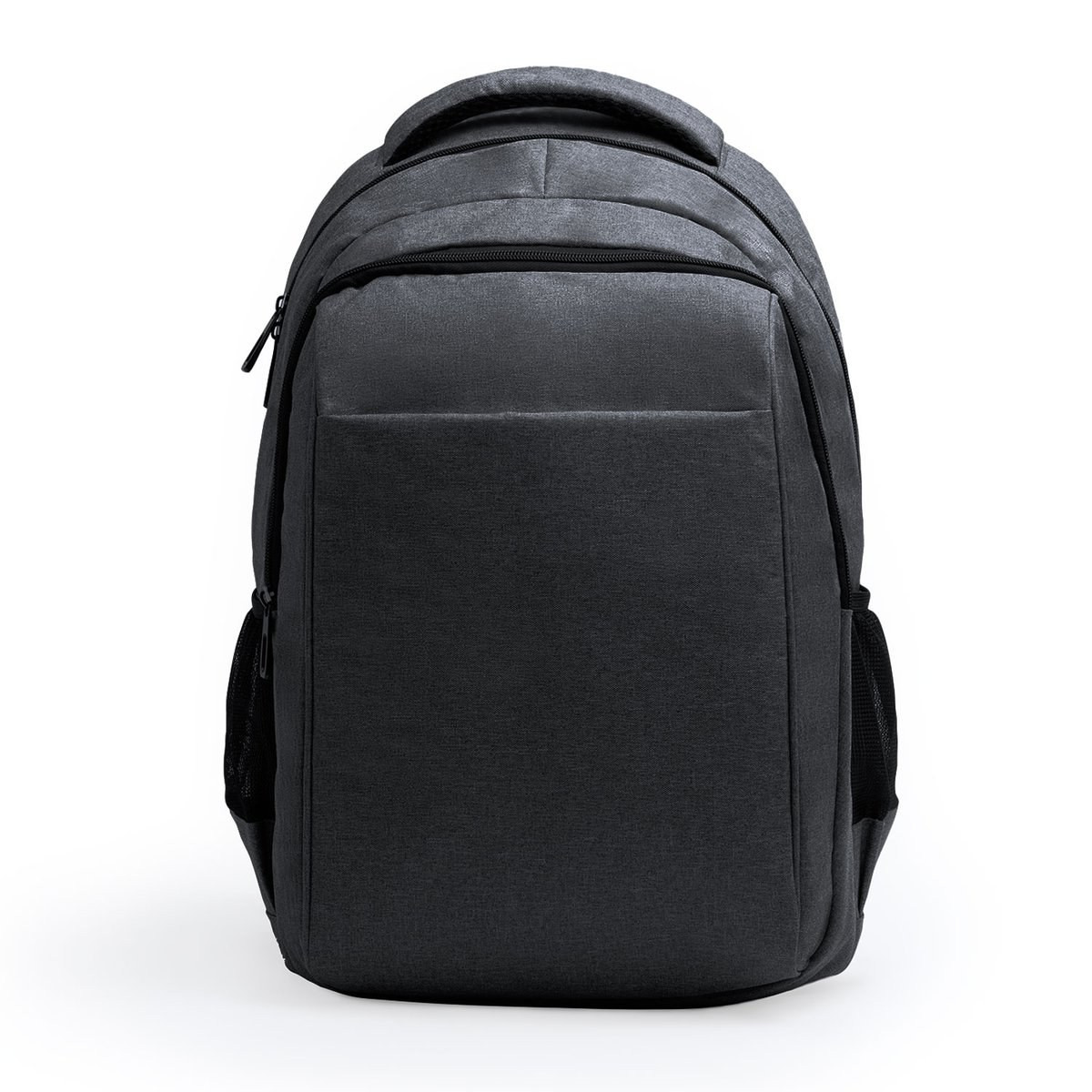 Computer backpack made in RPET 300D with a melange finish. Main compartment with padded computer pocket suitable for laptops or 13" tablets. Second compartment with zip closure. Front pocket with zip closure. Side pockets. Trolley strap.