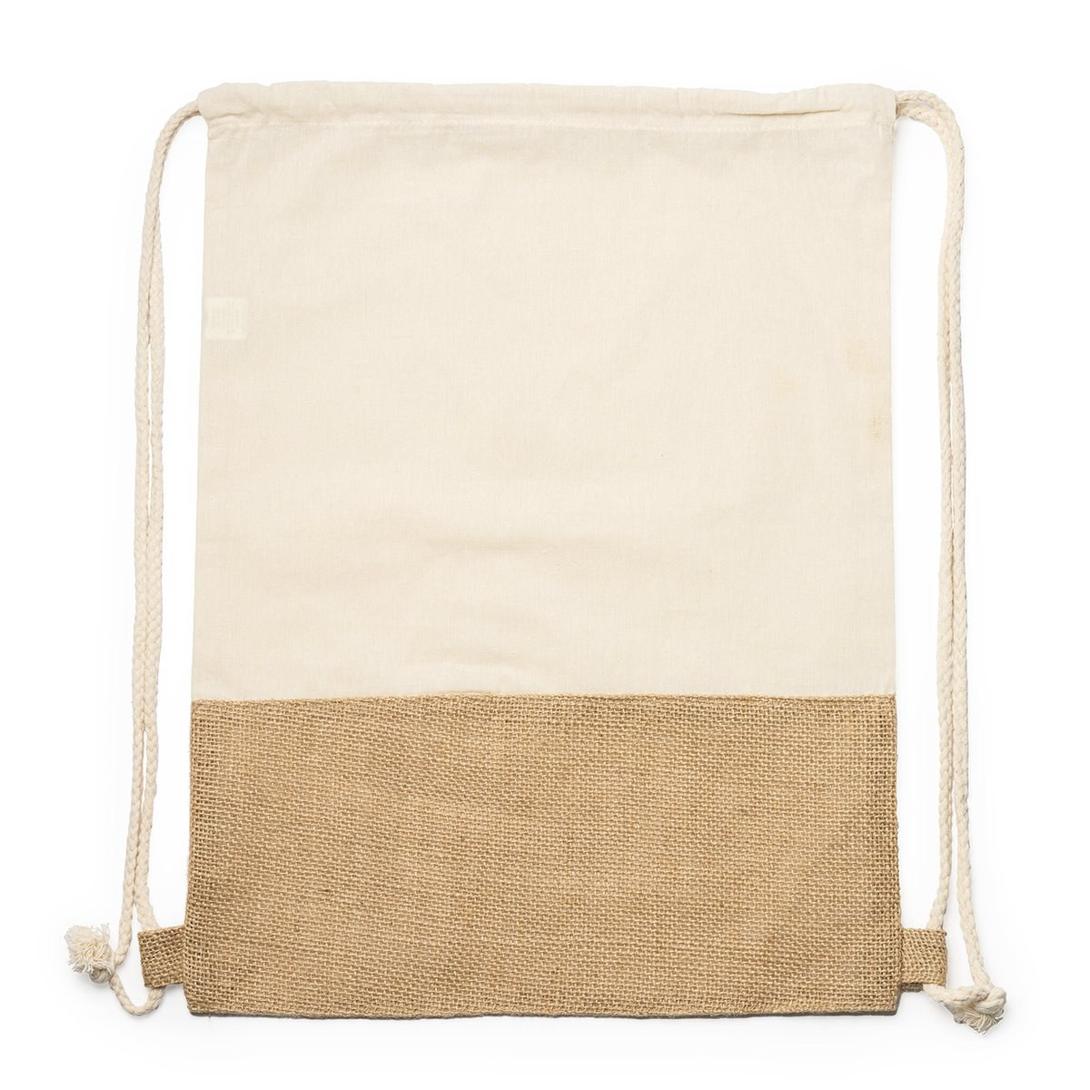 Drawstring backpack in nature line. Base in resistant jute and upper part in cotton 120g/m2. With thick, braided strings and reinforced corners.