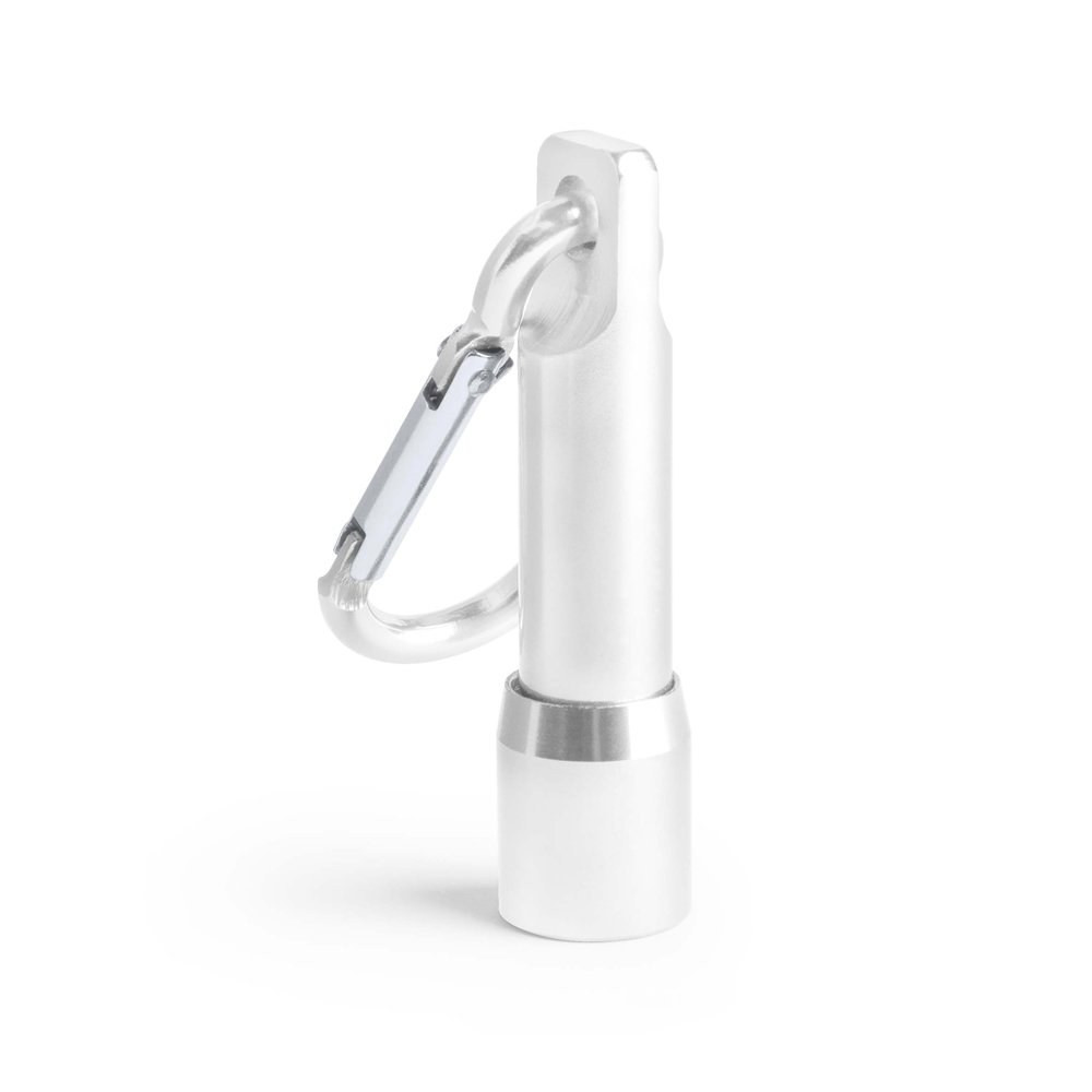 LED flashlight with resistant aluminium body in varied colors. With matching color carrying carabiner and button cell batteries included with protective film.