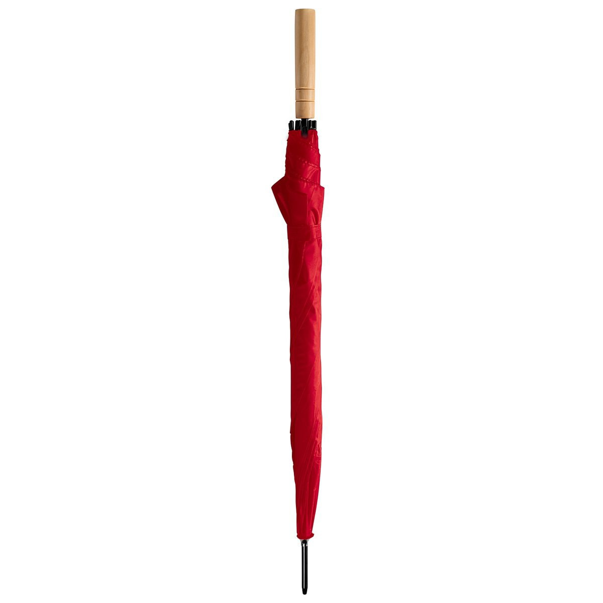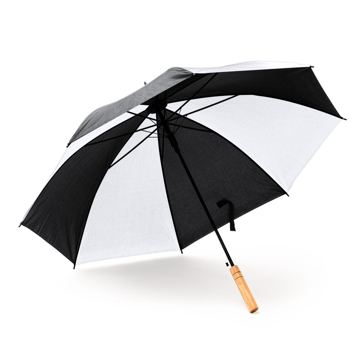 Umbrella made of 190T polyester with wooden handle and automatic opening. Ribs and tips in black. Velcro fastening.