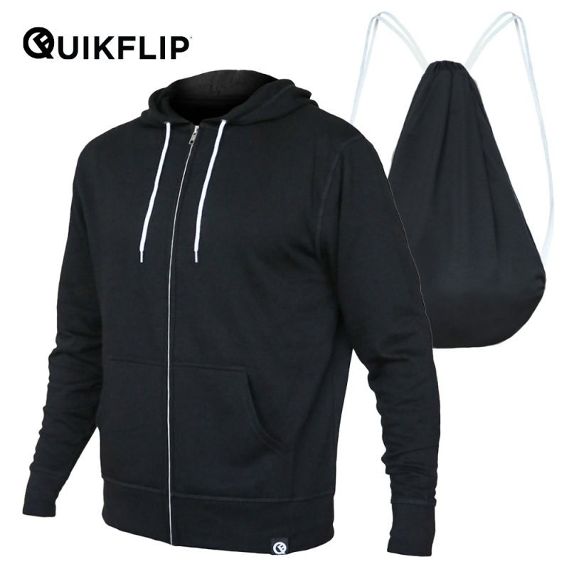 Full-zip hoodie with integrated backpack stuff sack, made of 220 gsm brushed fleece, 60% cotton and 40% polyester. White coil zipper with custom metal puller. 1x1 ribbed cuffs and waistband. Lightweight, breathable microfiber lining makes the stuff sack invisible inside the hoodie. Non-adjustable, double-drawstring backpack straps. The hoodie can easily be folded and converted into a backpack stuff sack.