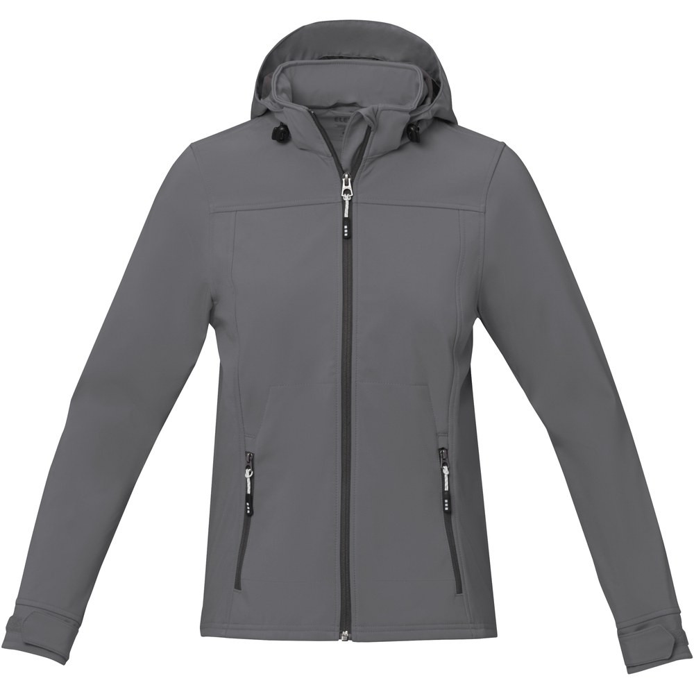 The Langley women's 2-layer softshell jacket – for ultimate outdoor performance. The jacket has a waterproof rating of 5000 mm, keeping you dry and shielded from the elements. Its exceptional breathability, with a rating of 3000 g/m², wicks away moisture, keeping you comfortable during intense activities. Enjoy unrestricted movement with the four-way stretch fabric, combining polyester and elastane (300 g/m²) designed to flex and adapt to your body's every motion. The bonded inner layer features a micro fleece made of polyester, complemented by TPU lamination, which enhances the jacket's insulation and warmth and protection to any type of weather. The detachable hood adapts to various weather conditions, while the adjustable cuffs with hook and loop closure guarantee a tight and comfortable fit. The elastic drawstring with an adjustable cord lock allows to tailor the jacket to any preference. With the inclusion of secure hand pockets with zippers, you can keep your essentials close at hand during any adventure. Be ready to take on any adventure in style, comfort, and confidence with the Langley softshell jacket. This jacket is designed with a fitted shape for a feminine look.