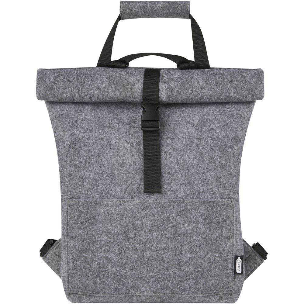 Multifunctional and trendy combined roll-top backpack and bicycle bag made of high quality, soft and durable GRS certified recycled felt. Features a large main compartment, front pocket, adjustable shoulder straps and 3 hook & look straps to attach the bag to the back of a bicycle. The shoulder straps can be easily transformed into a long carry handle system or bundled up so the straps stay clear from getting caught in a bicycle wheel.