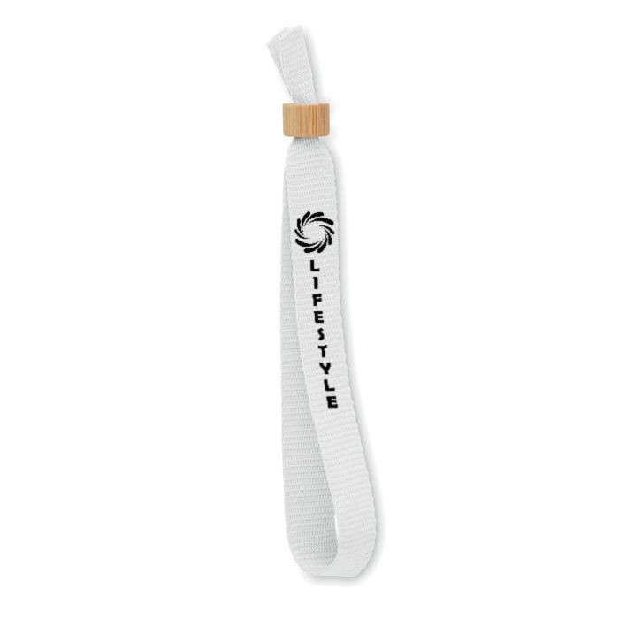 300D RPET polyester event wristband with bamboo ring closure.