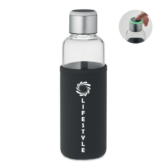 Borosilicate glass steel bottle with hydration reminder in pouch.