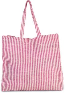 This bag has 55cm handles and is designed in a square shape with dyed fabric stripes and an inside zippered pocket.