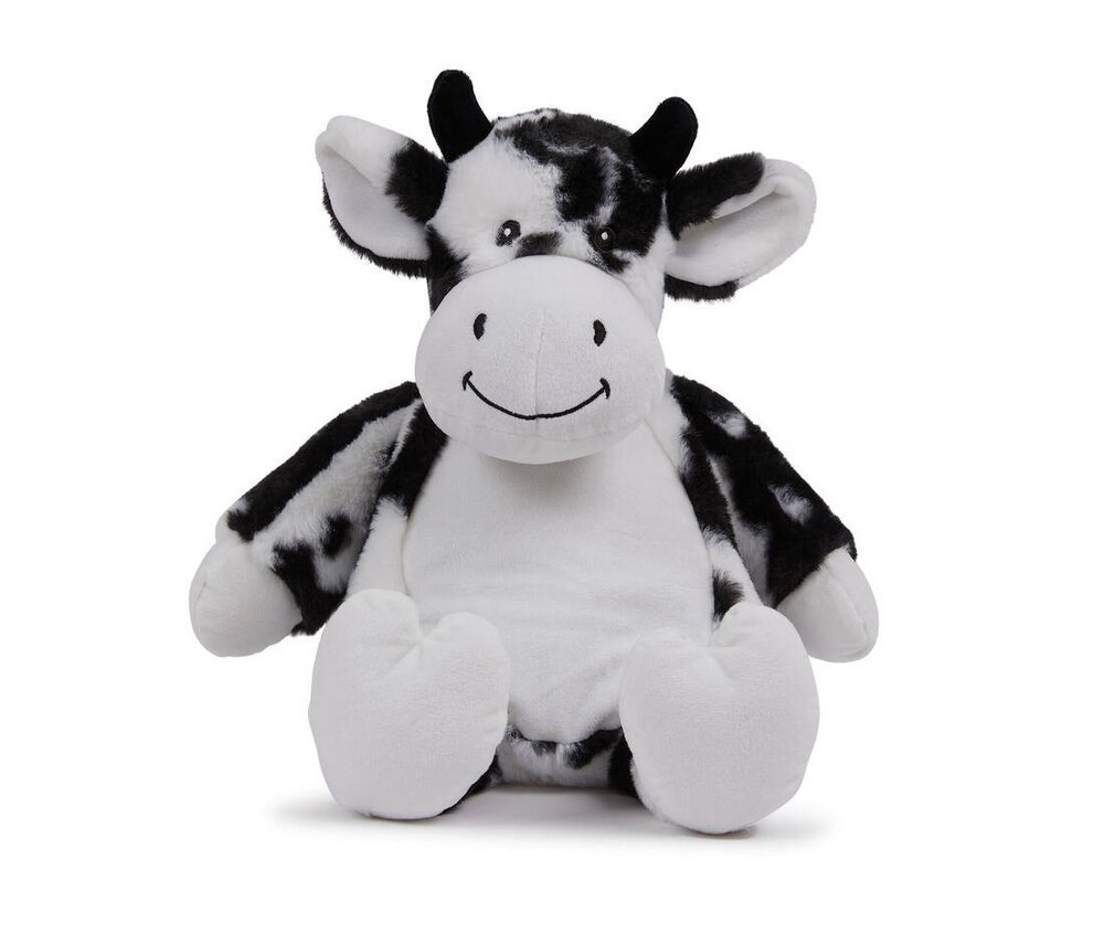 Soft plush Zippie Cow with contrast face and hooves. Sewn eyes and mouth. White panel on tummy perfect for decoration. Zip access on base for direct access onto the tummy for decoration. Removable separate inner head and body stuffing. Can be embroidered, vinyl and sublimation printed. Complies with EN71 European Toy Safety regulations. Remove all hang tags and their fasteners before giving these items to a child. Suitable for all ages.