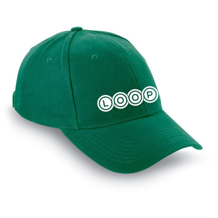 6 panel baseball cap in brushed cotton 260 gr/m2 with antique copperfinish metal clips on adjustable strap closure.