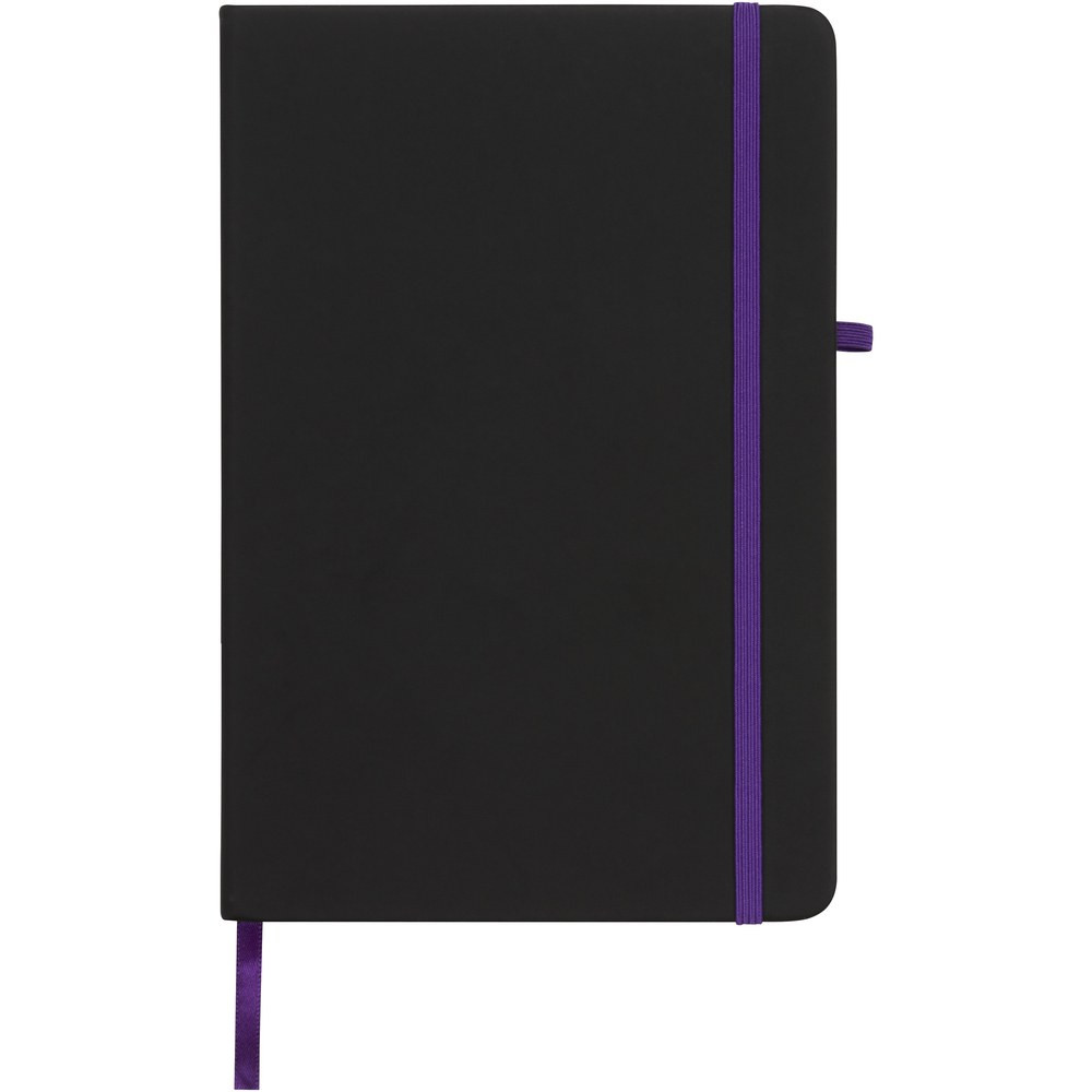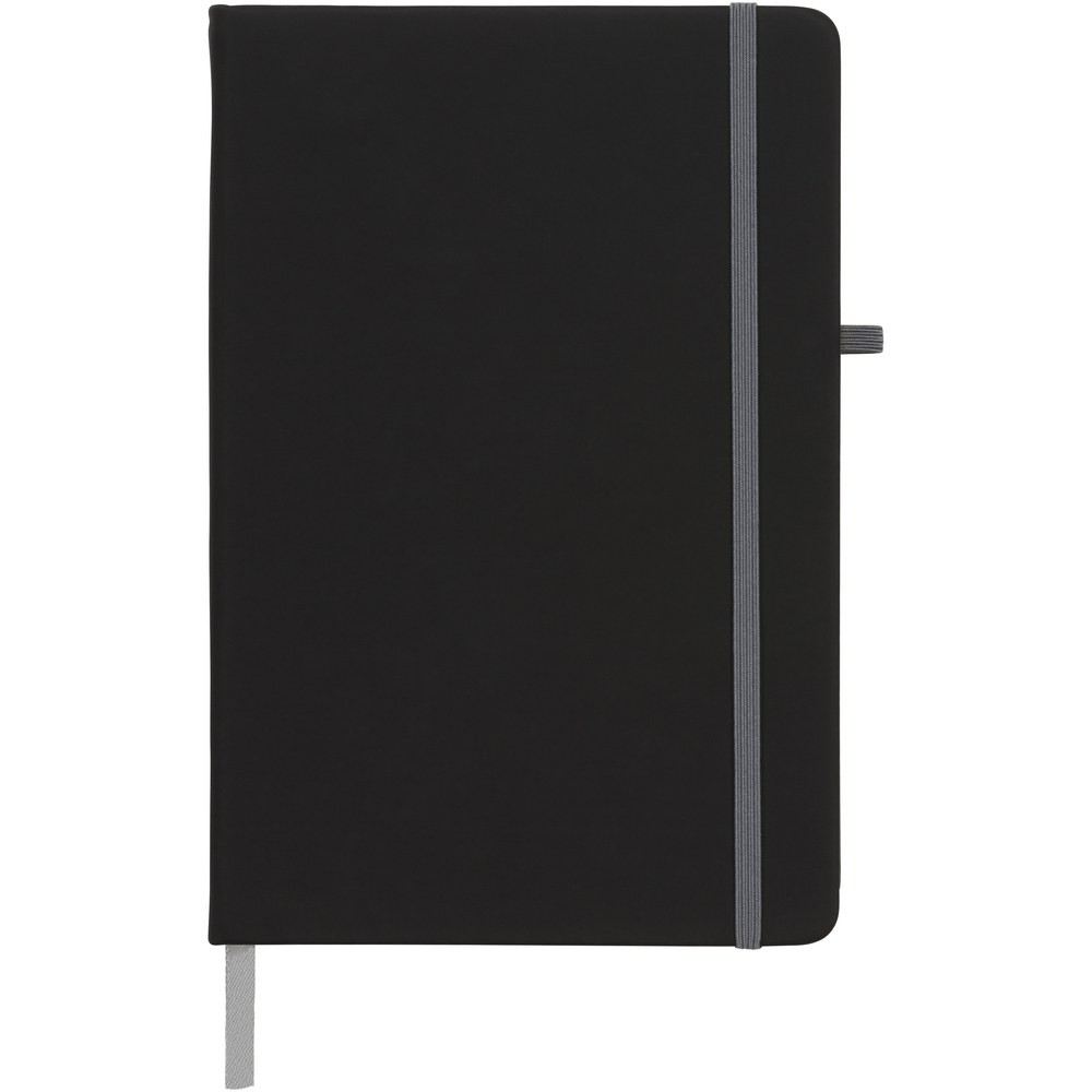 The Noir notebook has a soft-feel black PU cover, for creating a tactile finish to the notebook. Each notebook has a coloured closure strap, pen loop and ribbon page marker. The notebook contains 96 sheets (70g/m2) cream lined paper.