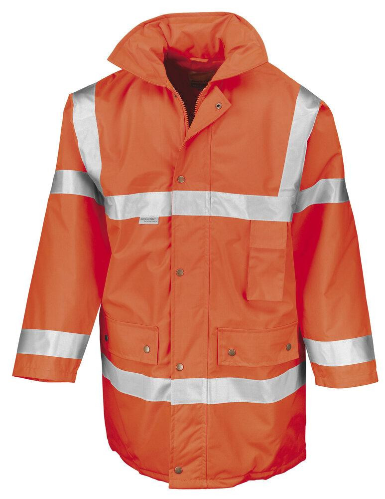 Safety jacket with 3M reflective silver 5cm bands. Concealed hood, inside pocket, pockets with flaps and stud fastenings, mobile phone pocket, fully taped waterproof seams. Conforms to 89/686/EEC directive. Concealed access for print and embroidery. Contains recycled material.Decoration Guidelines:Decorating methods: Embroidery, Direct print, Transfer print & Screen print transfer. Decorators access point: Inner back hem zip Washing Instructions Do not bleach. Do not iron. Do not dry clean. Do not tumble dry