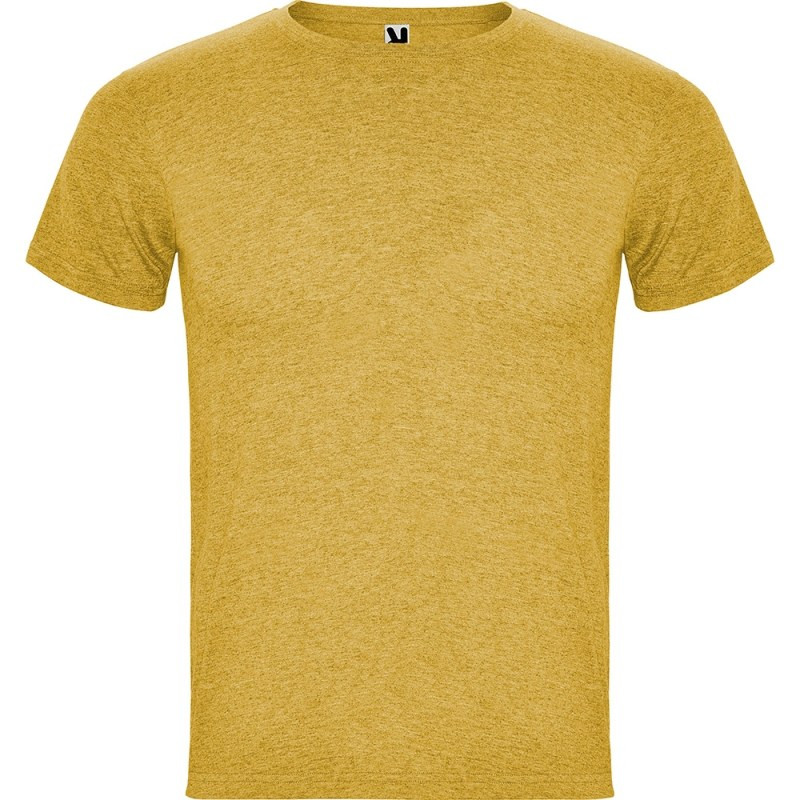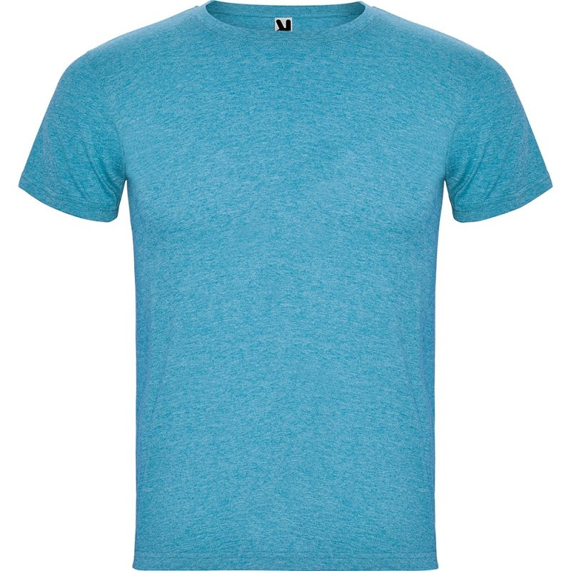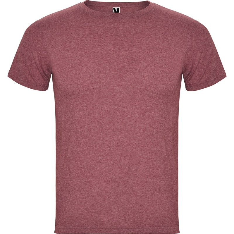 Short-sleeve t-shirt with heathered effect. 1x1 ribbed crew neck with interior reinforced covered seams. Tubular fabric. Removable label.