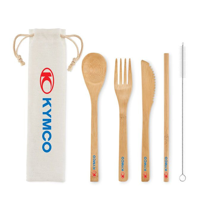 Includes knife, fork, spoon and straw in bamboo and stainless steel brush.