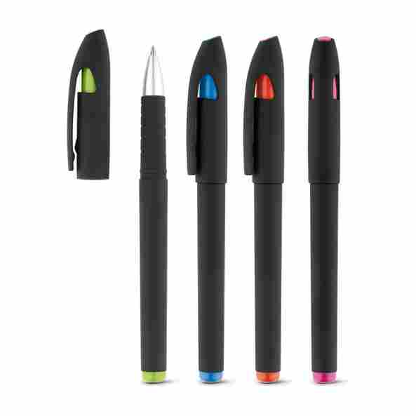 Ball pen with rubber soft touch finish. ABS cap and clip, colourful trim and anti-slip grip. Black gel ink