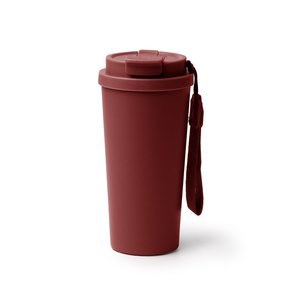 Features a lid with a flip-up straw and an individual closure on one side, plus a dispenser with a cap on the opposite side.