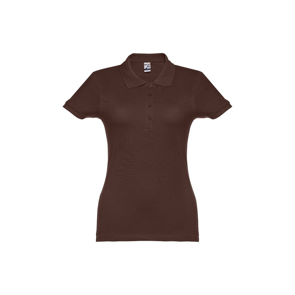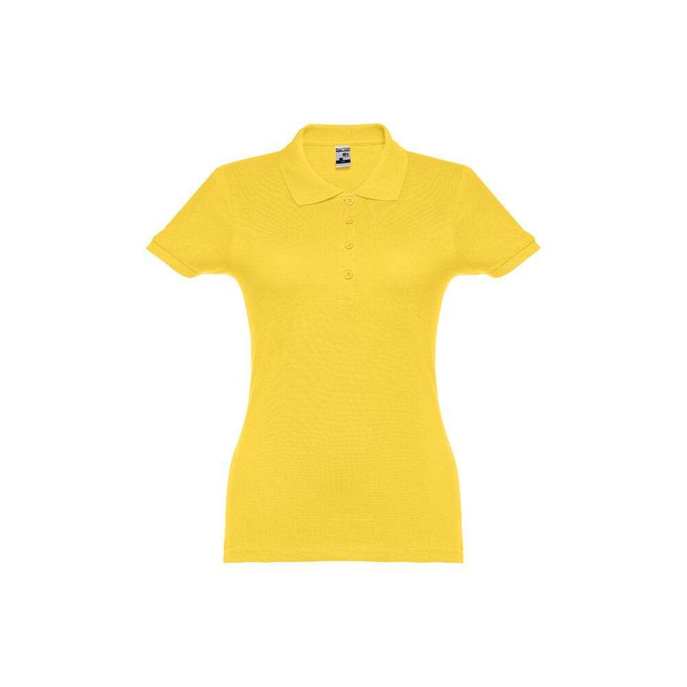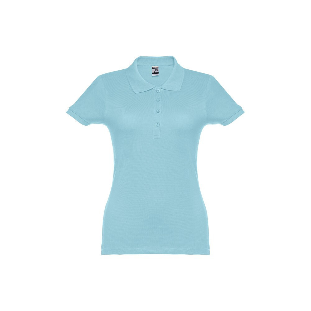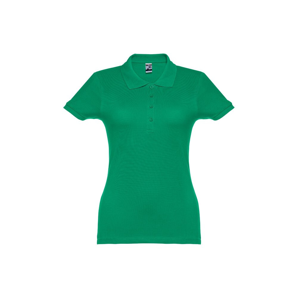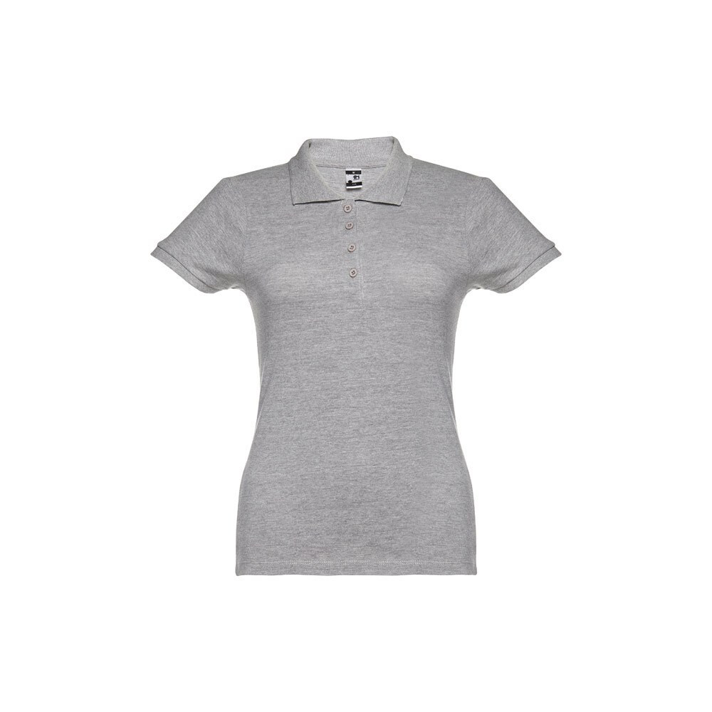100% carded cotton pique women's short sleeve polo (195 g/m²) (colour 183: 85% cotton/15% viscose). Features a rib collar and sleeves, the collar is reinforced with piqué ribbon. On the front, next to the collar, there are four matching colour buttons (extra button inserted in the inner seam). Piece cut and sewn. Sizes: S, M, L, XL, XXL Sizes: S, M, L, XL, XXL