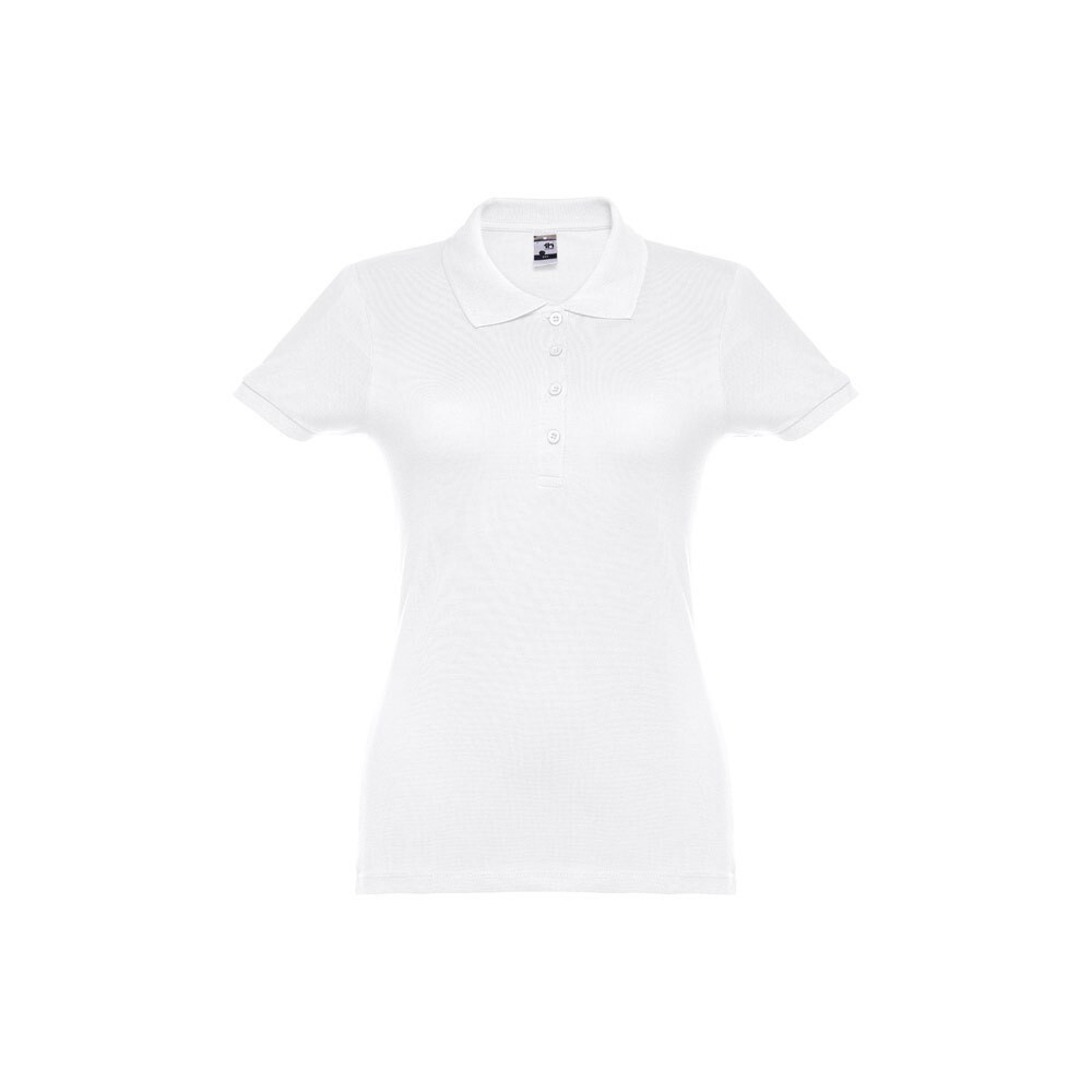 100% carded cotton pique women's short sleeve polo (195 g/m²). Features a rib collar and sleeves, the collar is reinforced with piqué ribbon. On the front, next to the collar, there are four matching colour buttons (extra button inserted in the inner seam). Piece cut and sewn