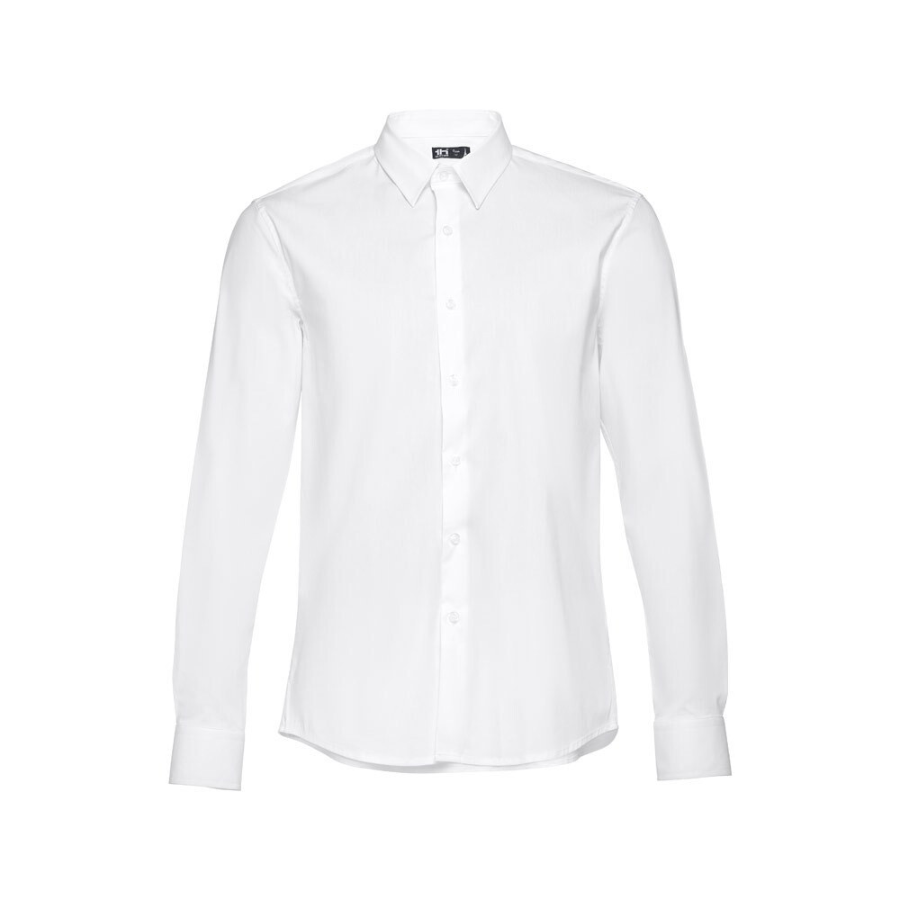 Long-sleeved men's shirt in 68% cotton, 28% polyamide and 4% elastane (115 g/m²). Long sleeve with 1 pleat and adjustable cuffs with 2 buttons. Placket with 7 buttons in matching colour
