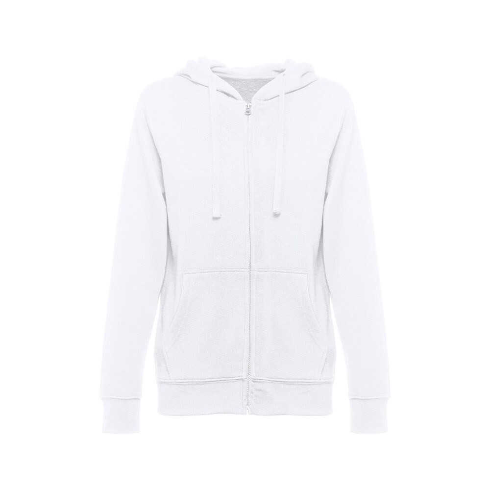 50% cotton and 50% polyester women's sweatshirt (320 g/m²) with carded interior. The hood is lined and contains colour cord closure. The front area has two marsupial pockets with plastic cover closure. Piece with cuffs and ribbon waistband