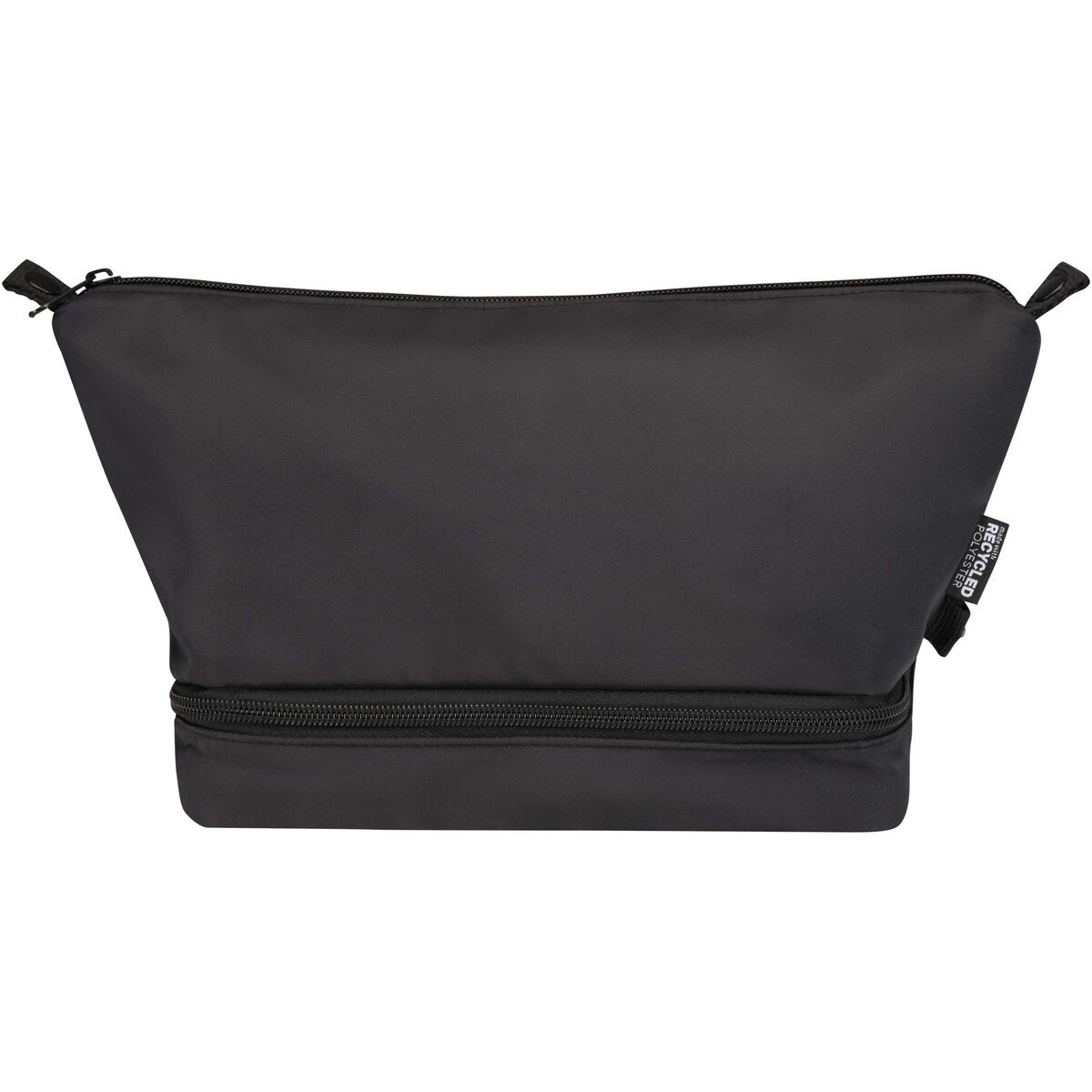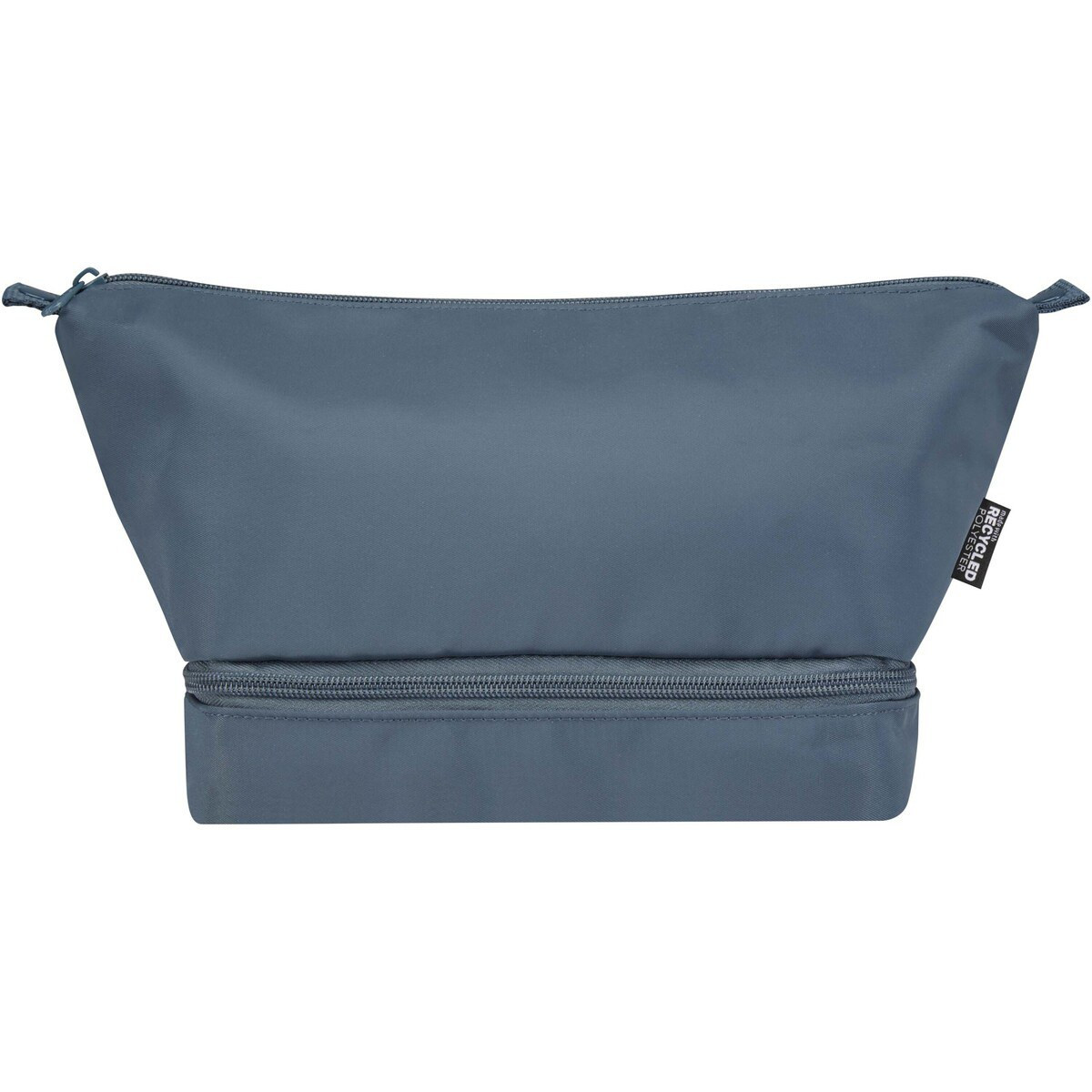 The Trip Aware™ recycled travel toiletry bag is a compact, structured bag designed to keep personal items neatly organised while travelling. Made from 290D twill polyester with a knitted backing and lined with RPET 210D/PU, it features a clean layout with practical compartments. The main compartment includes an internal zip pocket for smaller items, while the clamshell-style bottom compartment keeps essentials separate for easier access and improved organisation. Each bag also comes with an Aware™ tracer. This innovative feature allows users to trace the origins and journey of their item through a QR code, enhancing transparency in the supply chain and fostering a stronger connection between the product and its production process. Volume capacity: 6 litres.