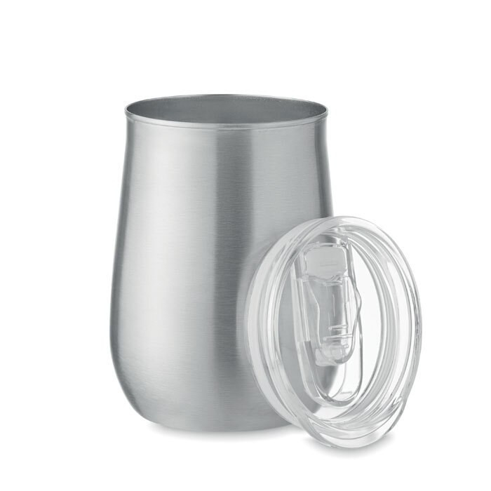 Recycled stainless steel (90% recycled stainless and 10% stainless steel) powder coated mug with lid with sliding sip hole cover.