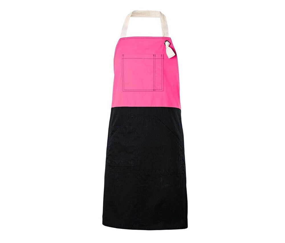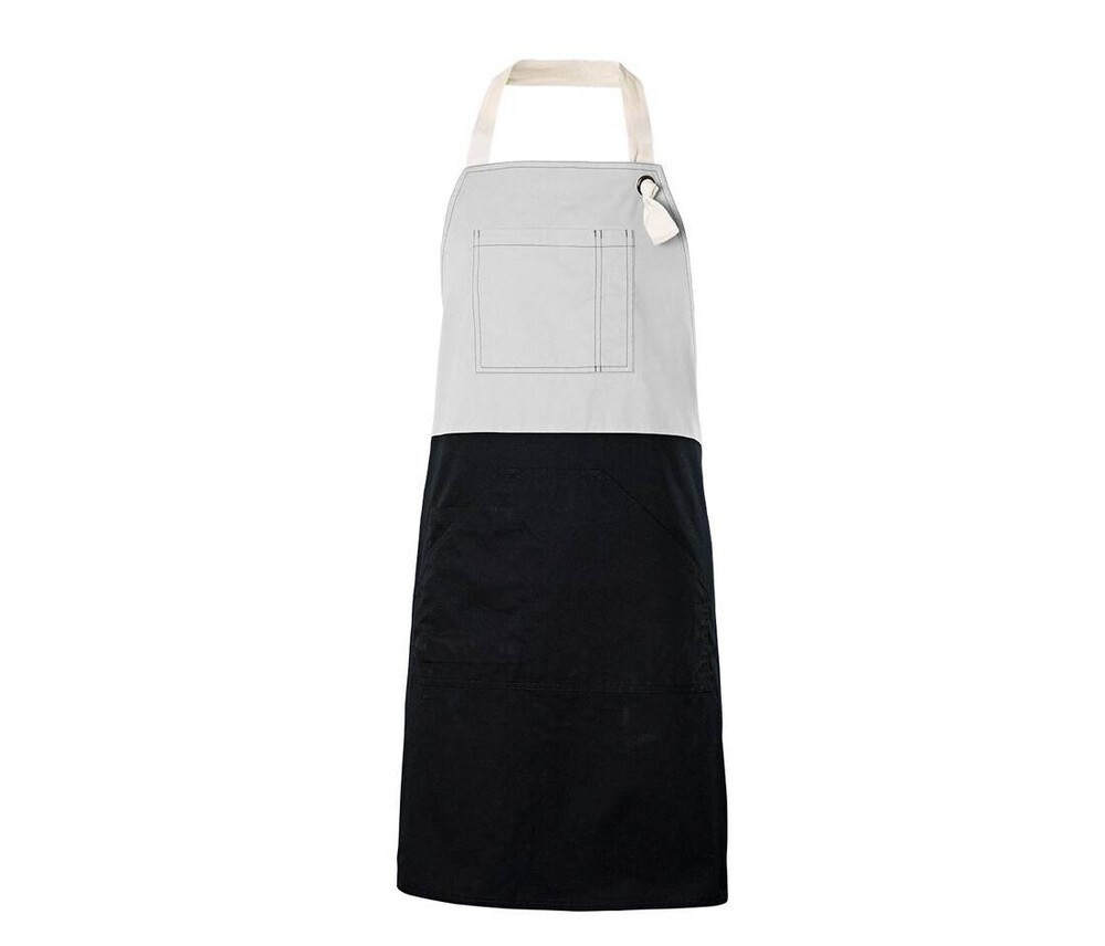 Choose this V4210B two-tone apron for men by Velilla for your waiters and cooks. This item is essential for keeping dirt out of your clothes. The top is turquoise and the bottom is black, with a two-tone tone. It has two beige ties at the ends that can be adjusted to fit your body. You can keep your belongings in the three pockets. The neck can be adjusted at any time. Its material is a blend of polyester and cotton, and it withstands rigorous testing. This apron is available in a variety of colors, including beige, orange, gray, green, sky blue, purple, fuchsia, green, yellow, light gray, white, red, turquoise, and pink.