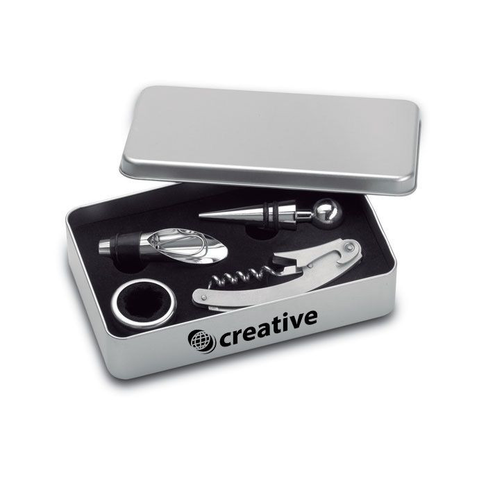 Choose this wine accessory set and present it to your guests. This set includes a corkscrew, stopper, pourer and drip ring, essential accessories for a wine tasting. Made of stainless steel, they are attractively presented in a silver-coloured box.