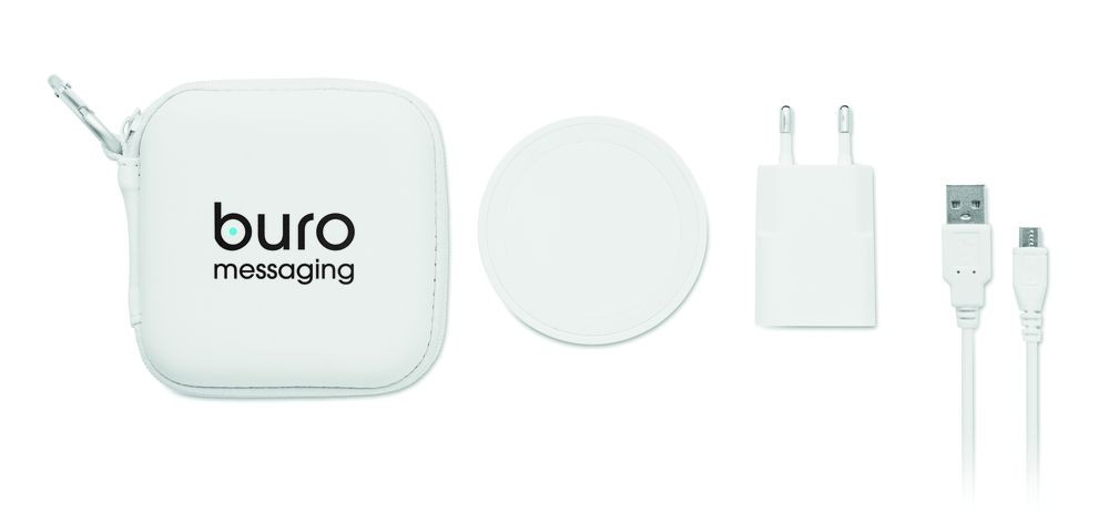 White wireless charger set in ABS. Presented in an EVA / PU pouch. It contains a European plug and a USB A to Micro B charging cable. Output data: DC5V /