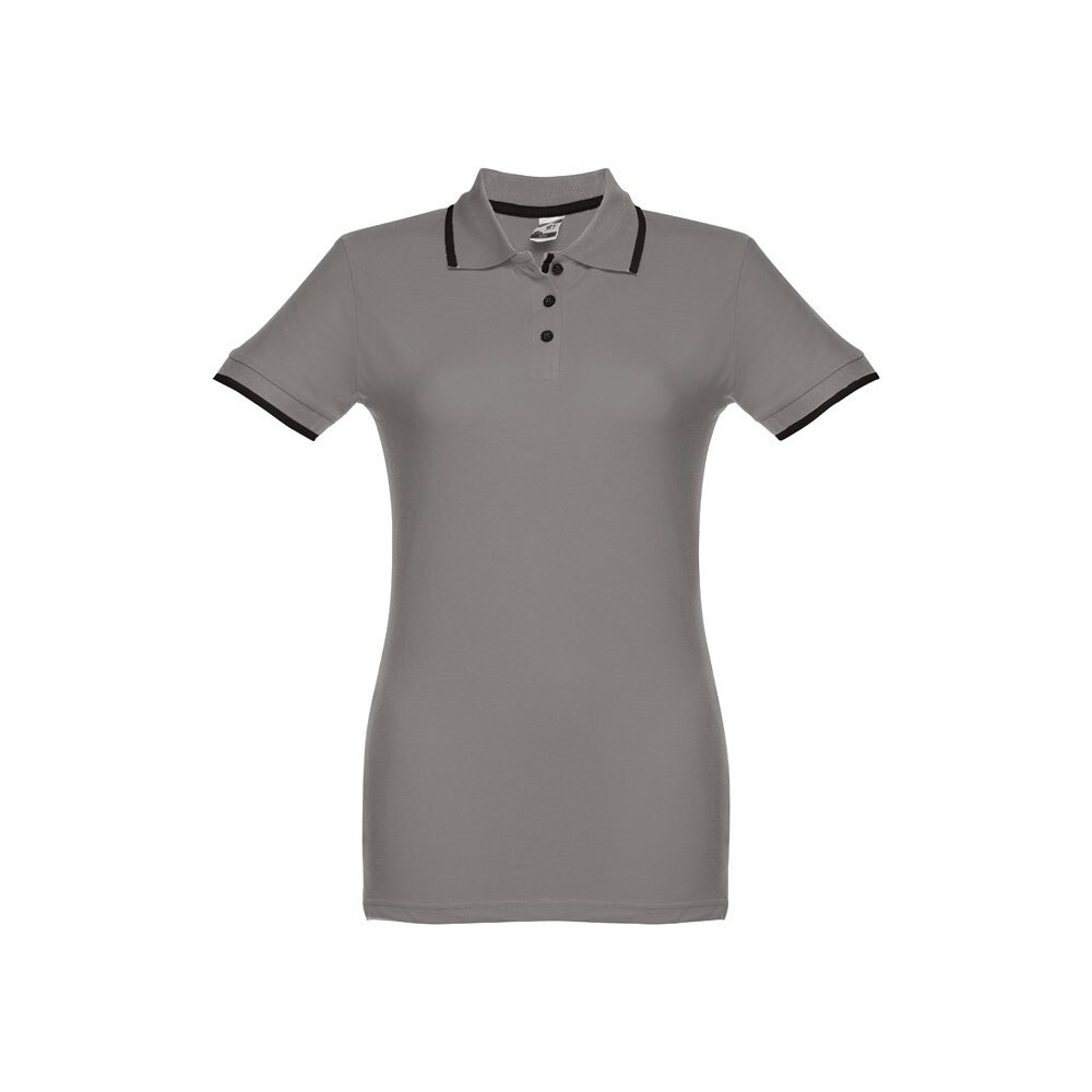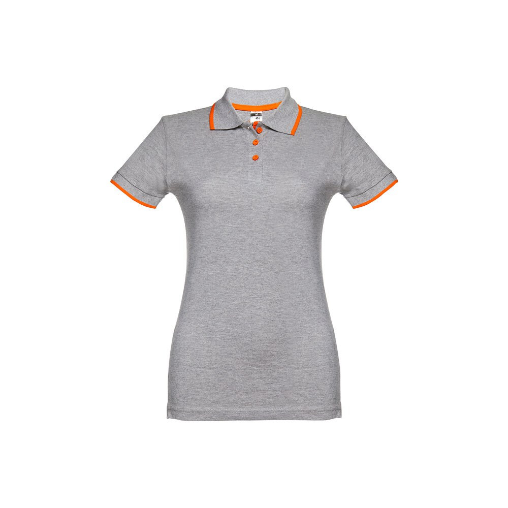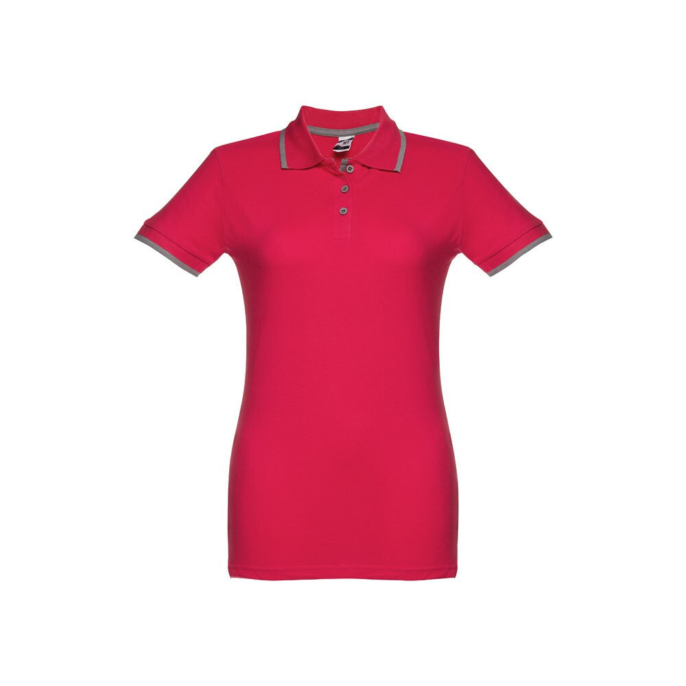 Short-sleeved bicolour polo for women in 100% carded cotton pique (210 g/m²) (colour: 183: 85% cotton/15% viscose). Two-colour contrast on the collar, sleeve and placket. Features a collar and cuffs in Rib. Reinforced placket with 3 contrasting colour buttons (extra button inserted in the inner side seam). Fitted waist and small side vents at the hemline of the polo
