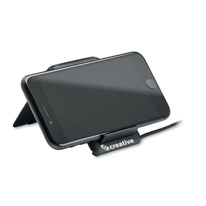 Compact storage for cable, connector and cards with wireless charger 15W and phone stand functionality.