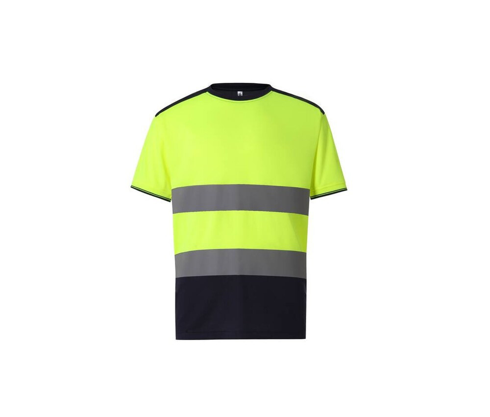 Breathable stretch t-shirt. Fast drying. 2 large reflective horizontal strips. Navy contrasting panels on the shoulders, collar, wrists and size. Side slits with reinforced seams. Without brand label. Compliant with ISO 20471 Class 2 certification, the Hi color Orange / Navy color also complies with RIS-3279-Tom Railway.
