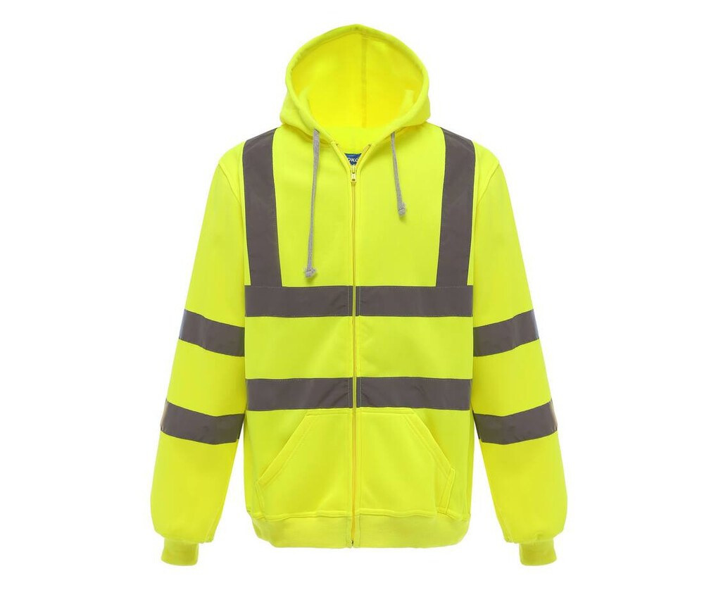 Hooded sweatshirt with a big zipper on the front. This model allows to be more visible thanks to 2 vertical stripes on the shoulders and 2 horizontal stripes at the bottom of the hoody. The stripes are reflective and sewn. Each band measures 5cm. This model also has 2 reflective stripes on the sleeves. For a better comfort, the cuffs and the hem are ribbed. The hood can be adjusted with drawstrings. It has 2 front pockets. Double topstitching on the whole sweatshirt for a longer durability. This model complies with EN ISO20471:2013 Class 3 certification. Hi-vis orange also complies with GO/RT 3279 specification.